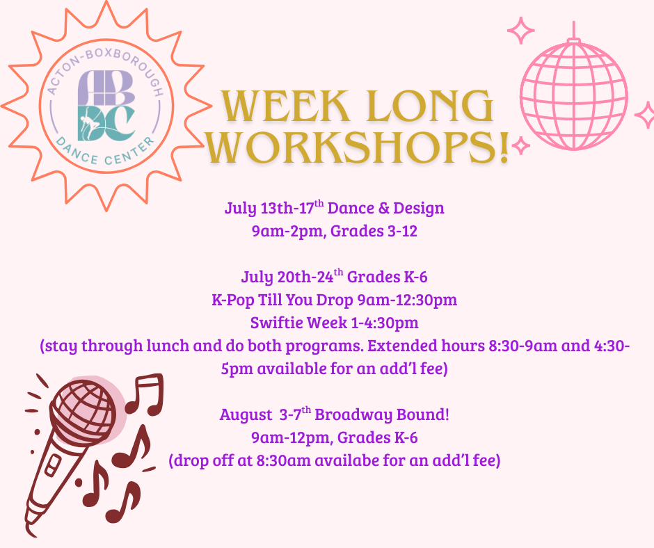 Looking for full week workshops? Look no further! Our K-Pop Till You Drop, Swiftie Week, Broadway Bound, and Dance & Design programs will keep kids moving, creating, and having a blast with our talented faculty!