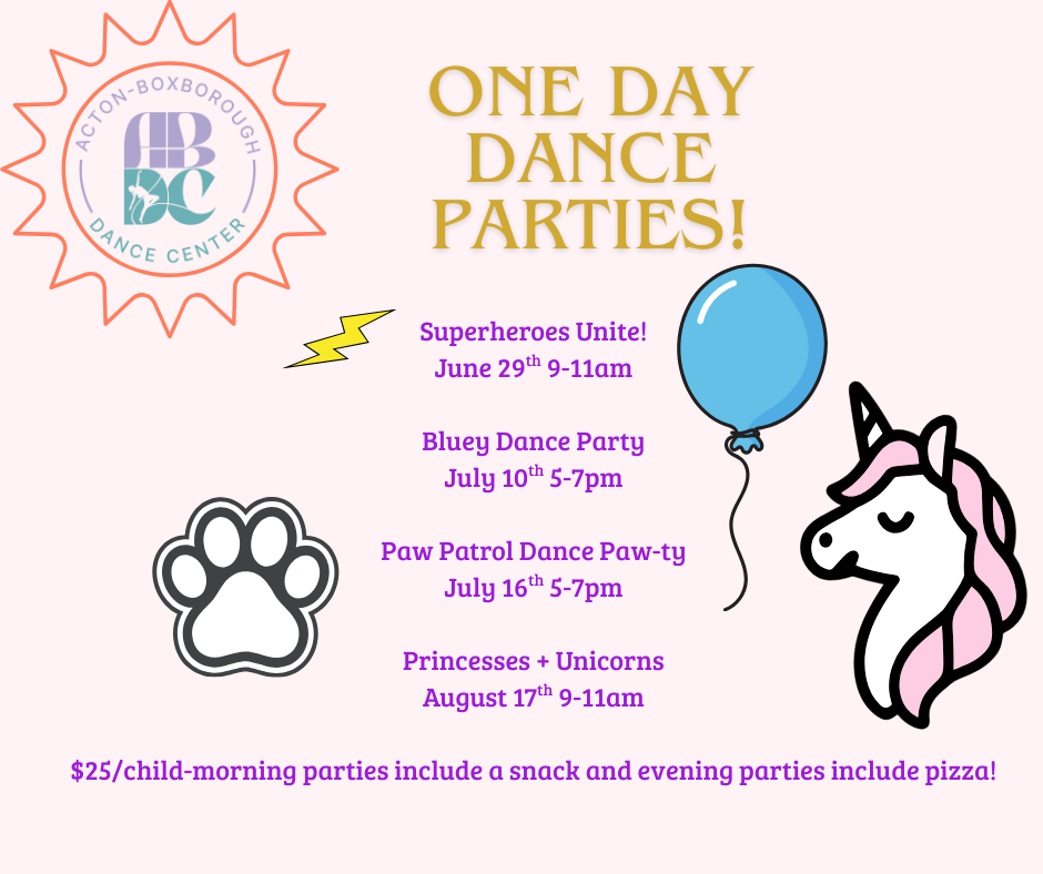 Need a few hours on your own this summer? Our summer dance parties are designed to give you a couple hours of you time while the kiddos have a blast-without committing to a whole program. They are also a great way to introduce your child to dance!